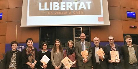 A la fotografia: feta al final del discurs amb la imatge de petició de llibertat dels Jordis, són presents los representants de la Plataforma per la Llengua i el president de l’Intergrup, l’eurodiputat Josep Maria Terricabras.
